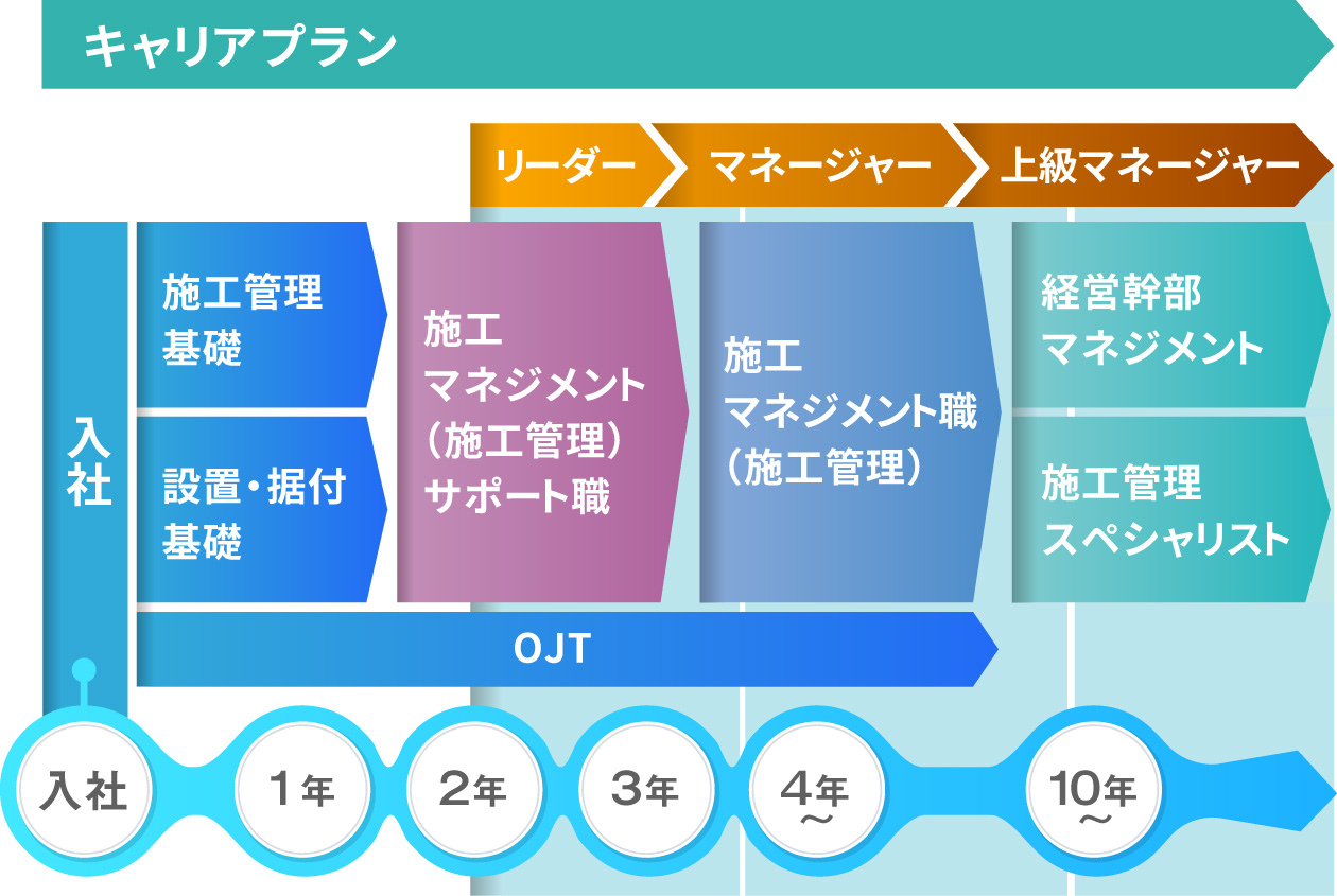 将来に向かって価値がアップしていくヤマモトSCの施工マネジメント(施工管理)の仕事。このスキルを1から学んで習得するための研修制度が充実しています。未経験からプロになれるサポートです。