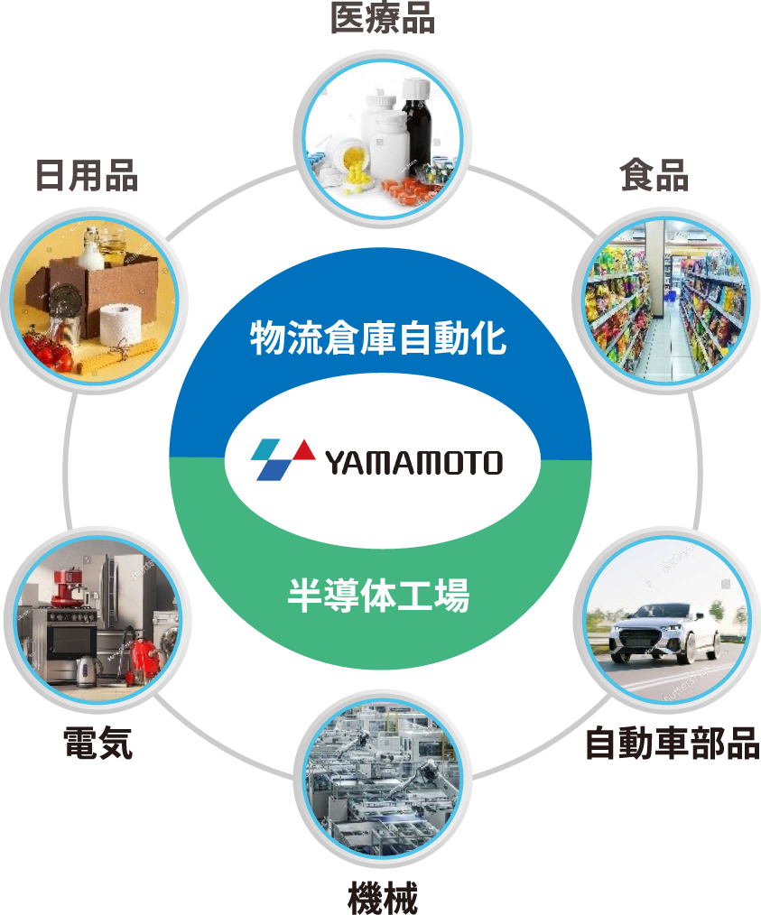 日本中のあらゆる業界の自動化の流れに乗って、ヤマモトSCは大手物流企業とのパートナーシップを通して、さまざまな業界の自動化に取り組んでいます。その業界は、物流/半導体/食品/医薬品/飲料/化学/電池/自動車部品/機械/電子・精密機器/日用品/セントラルキッチン/納骨堂など、みなさんの生活に欠かせないサービスや商品に及びます。実績・技術・ノウハウを結集してあらゆる産業の自動化の実装を実現します。